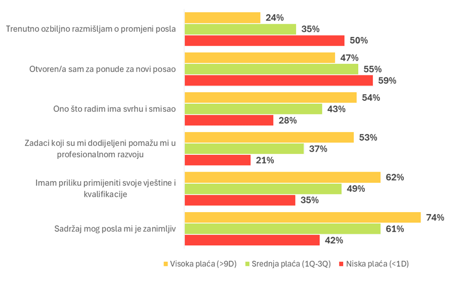 Istraživanje također pokazuje da bolje plaćeni zaposlenici osjećaju veći angažman, učinkovitije koriste svoje vještine i rjeđe ozbiljno razmišljaju o promjeni posla u odnosu na one s nižim primanjima. Međutim, i među njima bi se gotovo polovica odlučila na odlazak kad bi se pojavila bolja prilika. U Hrvatskoj, među radnicima s nižim plaćama, polovica (50 %) aktivno traži novi posao, 42 % smatra svoj posao zanimljivim, dok samo 28 % pronalazi svrhu i dublji smisao u radu.