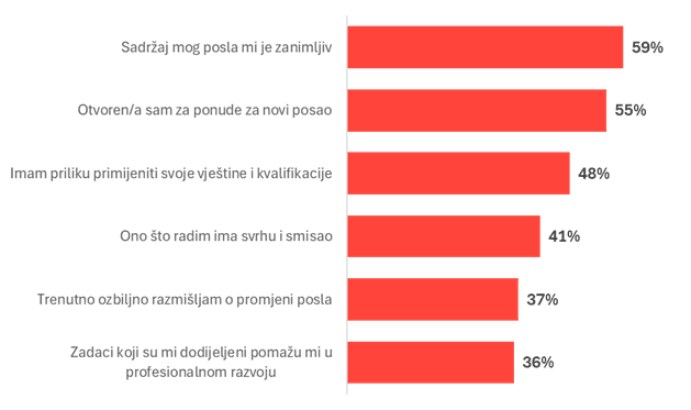 Ipak, želja za promjenom i dalje postoji. Više od polovice sudionika istraživanja tvrdi da bi razmotrili novi posao ukoliko im se ponudi bolja prilika, a svaki treći ozbiljno razmišlja o promjeni poslodavca.